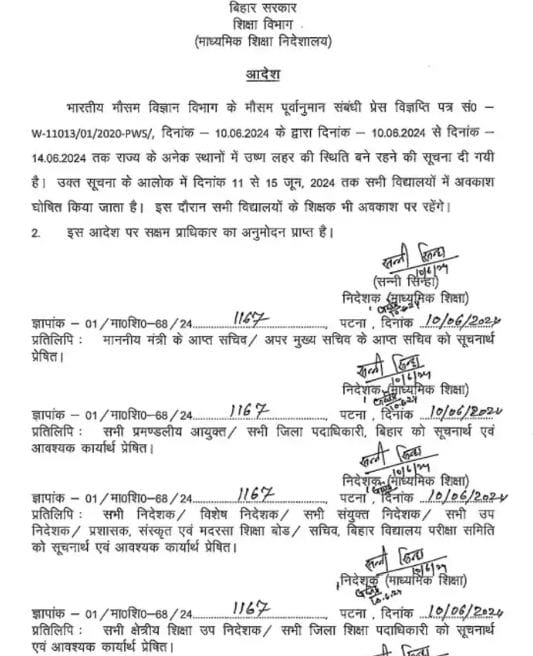 इससे संबंधित आदेश माध्यमिक शिक्षा निदेशक सन्नी सिन्हा की ओर से सोमवार को जारी किया गया है।इसमें कहा गया है कि भारतीय मौसम विज्ञान विभाग के मौसम पूर्वानुमान के मुताबिक 14 जून तक राज्य के अनेक स्थानों में उष्ण लहर की स्थिति बने रहने की सूचना दी गयी है।इसके मद्देनजर 11 से 15 जून तक सभी विद्यालयों में अवकाश घोषित किया जाता है। इस दौरान विद्यालयों के शिक्षक भी अवकाश पर रहेंगे।