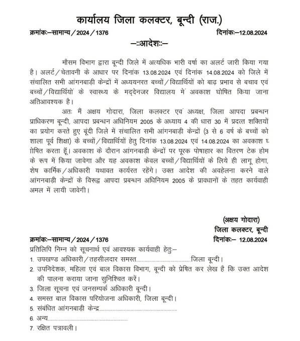 - बूंदी और भरतपुर जिला कलेक्टर ने अत्यधिक वर्षा के मद्देनजर आदेश जारी कर जिले में संचालित समस्त आंगनबाडी केन्द्रों में 13 , 14 अगस्त 2024 को अवकाश घोषित किया है। शेष स्टाफ यथावत कार्य करेगा।