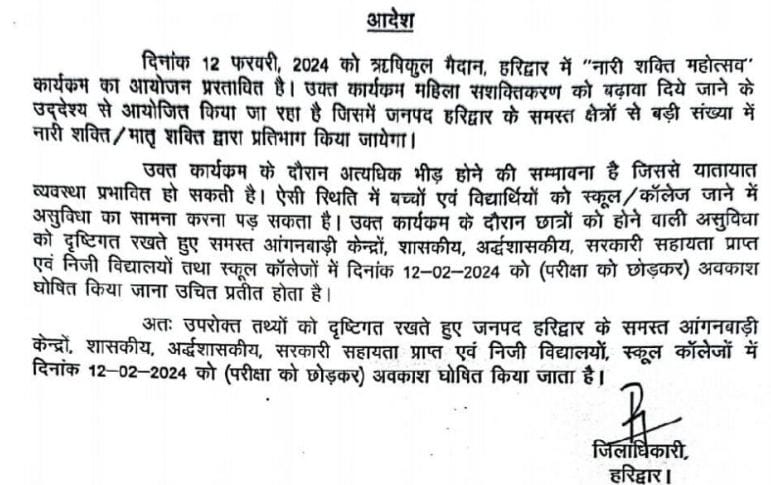 School Holiday 2024 : स्कूली छात्रों के लिए एक अच्छी खबर है। उत्तराखंड जनपद हरिद्वार के जिलाधिकारी धीराज सिंह गर्ब्याल ने 12 फरवरी को स्कूलों कॉलेजों में अवकाश घोषित किया है, इसके तहत समस्त आंगनबाड़ी केन्द्रों, शासकीय, अर्द्धशासकीय, सरकारी सहायता प्राप्त एवं निजी विद्यालयों तथा स्कूल कॉलेजों में 12 फरवरी को अवकाश रहेगा, यह आदेश उन स्कूलों में लागू नहीं रहेगा, जिनमें परीक्षाएं चल रही हैं।
