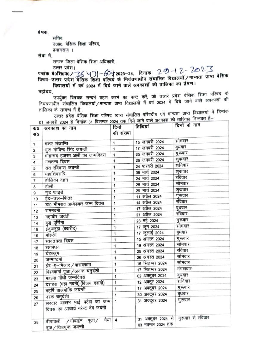 UP basic School Holiday 2024 : उत्तर प्रदेश के स्कूली छात्रों के लिए राहत भरी खबर है।यूपी बेसिक शिक्षा परिषद ने प्रदेश के सभी स्कूलों में शीतकालीन अवकाश 2024 की घोषणा कर दी है। यह अवकाश तालिका सचिव प्रताप सिंह बघेल ने जारी की गई है।साथ ही आदेश का सख्ती से पालन करने का निर्देश भी दिया गया है। वही मुस्लिम त्यौहार चन्द्र दर्शन के अनुसार मनाएं जायेंगे।