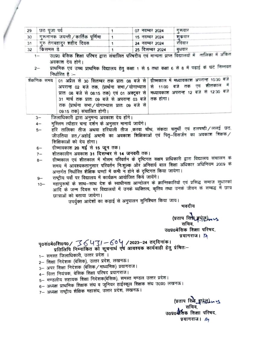 - ग्रीष्मकाल में मध्यावकाश सुबह 10:30 से 11 बजे तक तथा शीतकाल में दोपहर 12 से 12:30 बजे तक होगा।इसके अलावा बेसिक शिक्षा परिषद के तहत संचालित विद्यालयों/ मान्यता प्राप्त विद्यालयों के शिक्षक-शिक्षिकाएं अब पितृ विसर्जन की छुट्टी ले सकेंगे, लेकिन इस साल बसंत पंचमी पर अवकाश नहीं रहेगा।