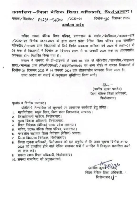 - आदेश के अनुसार 31 दिसंबर 2023 से 14 जनवरी 2024 तक शीतकालीन अवकाश घोषित किया गया है, वही ग्रीष्म अवकाश 20 मई से 15 जून तक रहेगा। राष्ट्रीय पर्वों पर विद्यालय में कार्यक्रम आयोजित किए जाएंगे। जिलाधिकारी द्वारा अनुमन्य अवकाश देय होंगे।