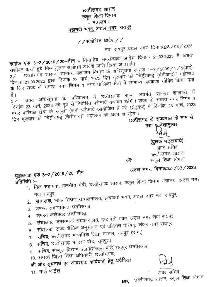 साथ ही शिक्षा विभाग द्वारा भी आदेश जारी किए गए हैं। स्कूल शिक्षा विभाग द्वारा संशोधित आदेश जारी करते हुए कहा गया कि समस्त शालाओं में 23 मार्च को पूर्व से निर्धारित परीक्षाएं यथावत रहेगी। हालांकि शेष स्कूलों में 23 मार्च को चैती चांद महोत्सव पर अवकाश घोषित किए गए हैं।