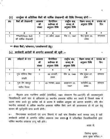 - यदि किसी पर्व, त्योहार या फिर महापुरुषों की जयंती एक ही दिन पड़ती है तो अलग से अतिरिक्त सार्वजनिक अवकाश घोषित नहीं होगी। 2025 में 14 अवकाश शनिवार और रविवार को पड़ रहे हैं, ऐसे में कुछ छुट्टियों का लाभ स्कूली बच्चों को नहीं मिल सकेगा।