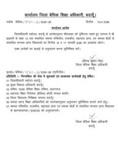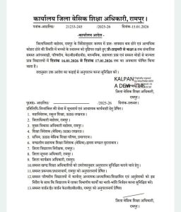 - बदायूं: जनपद में प्री प्राइमरी से कक्षा 12वीं तक संचालित समस्त परिषदीय, राजकीय, सहायता प्राप्त एवं समस्त बोर्डों से संचालित मान्यता प्राप्त स्कूलों में 17 जनवरी 2026 तक अवकाश घोषित किया गया है।