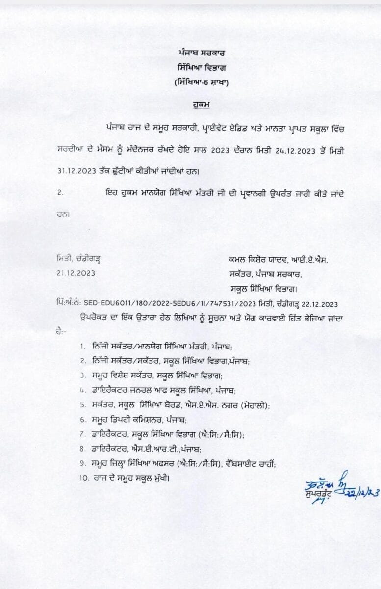 पंजाब में 8 दिन सर्दियों की छुट्टियां