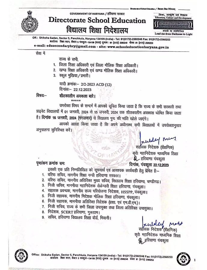 हरियाणा में 15 दिन का शीतकालीन अवकाश