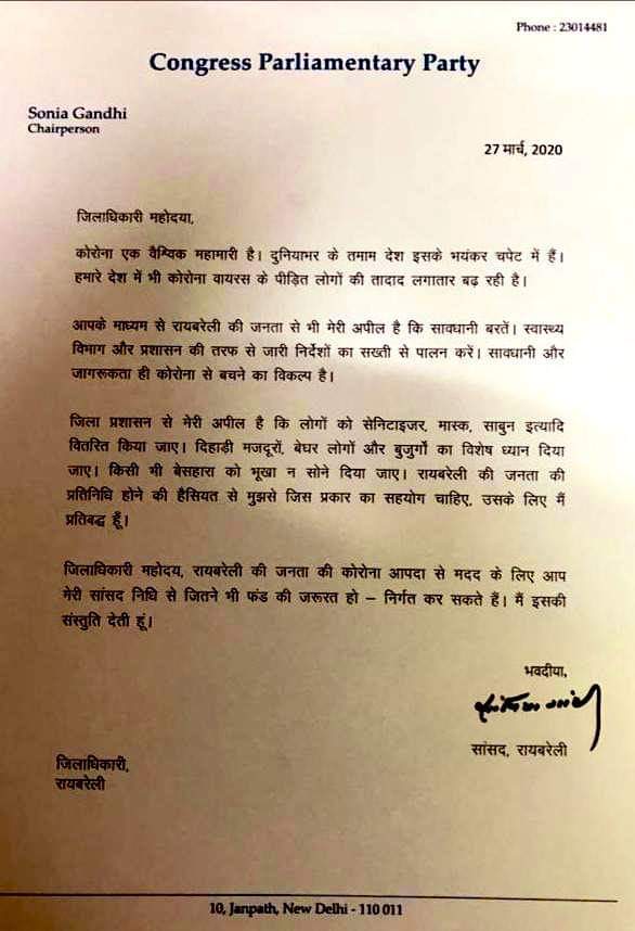 नई दिल्ली। एक तरफ पूरा देश में कोरोना महामारी से लड़ रहा है, अब तक देशभर में 734 से अधिक लोग इसकी चपेट में आ चुके हैं। इससे निपटने के लिये राजनेता, कलाकार, खिलाड़ियों सहित कई लोग मदद के लिये आगे आ रहे हैं। इसी कड़ी में अब कांग्रेस संसदीय दल की अध्यक्ष सोनिया गांधी ने अपने संसदीय क्षेत्र रायबरेली की मदद की पेशकश की है। सोनिया गांधी ने अपने संसदीय क्षेत्र रायबरेली की के लिये प्रशासन को पूरी सांसद निधि का इस्तेमाल करने की पेशकश की है। वे चाहती हैं कि इस राशि का इस्तेमाल उनके संसदीय क्षेत्र के लोगों को कोरोना वायरस से बचाने के लिए हो। इसी के साथ वो चाहती हैं कि लोगों को साबुन, सैनिटाइजर और मास्क भी बांटा जाए।