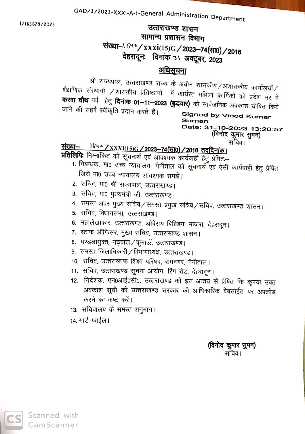 राज्यपाल गुरमीत सिंह ने शासकीय, अशासकीय कार्यालयों व शिक्षा संस्थानों में महिला कर्मचारियों के लिए एक नवंबर को सार्वजनिक अवकाश घोषित किया है। मंगलवार दोपहर सचिव विनोद कुमार सुमन ने इसके आदेश भी जारी कर दिए हैं। सचिव विनोद कुमार सुमन द्वारा जारी आदेश में कहा गया हैं कि “राज्यपाल, उत्तराखण्ड राज्य के अधीन शासकीय / अशासकीय कार्यालयों/ शैक्षणिक संस्थानों / शासकीय प्रतिष्ठानों में कार्यरत महिला कार्मिकों को प्रदेश भर में करवा चौथ पर्व हेतु दिनांक 01-11-2023 (बुद्धवार) को सार्वजनिक अवकाश घोषित किये जाने की सहर्ष स्वीकृति प्रदान करते हैं।