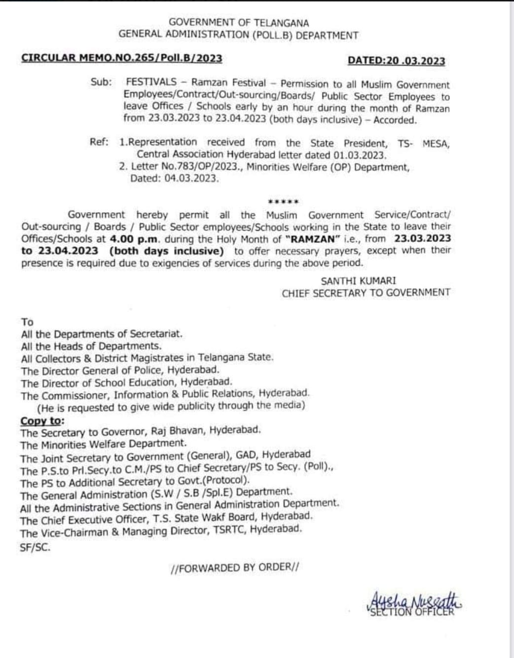 दरअसल, आगामी रमजान त्योहार के मद्देनजर, राज्य सरकार ने सोमवार को तेलंगाना में सरकारी सेवा / अनुबंध / आउटसोर्सिंग / बोर्ड और सार्वजनिक क्षेत्र की इकाइयों में सभी मुस्लिम कर्मचारियों को पवित्र महीने के दौरान शाम 4 बजे अपने कार्यालय / स्कूल छोड़ने की अनुमति दी है। रमज़ान में 23 मार्च से 23 अप्रैल तक (दोनों दिन सम्मिलित) आवश्यक प्रार्थनाएँ करने के लिए, सिवाय इसके कि जब उपरोक्त अवधि के दौरान सेवाओं की अनिवार्यता के कारण उनकी उपस्थिति आवश्यक हो, मुख्य सचिव, तेलंगाना सरकार, शांति कुमार ने सोमवार को एक परिपत्र में कहा।