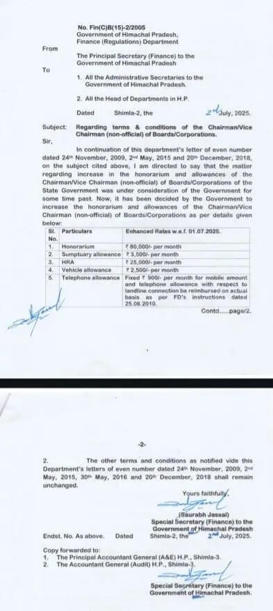 एक तरफ हिमाचल प्रदेश में मानसून का कहर जारी है। बादल फटने ,भारी बारिश और भूस्खलन से जनजीवन पूरी तरह से अस्त व्यस्त हो गया है, कई जिलों में तबाही मची हुई है।अर्थव्यवस्था डगमगा गई है। वही दूसरी तरफ सुखविंदर सिंह सुख्खू सरकार ने आपदा के बीच सार्वजनिक उपक्रम यानी निगम-बोर्ड के अध्यक्ष व उपाध्यक्ष का के मानदेय और भत्ते में भारी इजाफा किया है।