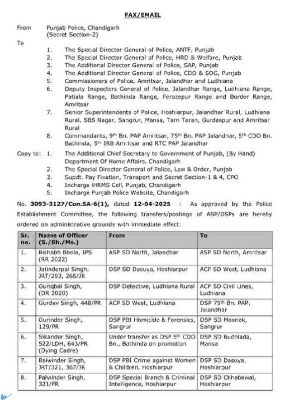 आईपीएस अधिकारी ऋषभ भोला को एएसपी एसडी नॉर्थ अमृतसर की कमान सौंपी गई है। वहीं 20 के करीब डीएसपी पद के अधिकारियों की अलग-अलग जगह तैनाती की गई है।इससे पहले भारतीय प्रशासनिक सेवा के 3 अफसरों डीके तिवारी, कमल किशोर यादव व वरुण रूजम को नई जिम्मेदारी सौंपी गई थी।