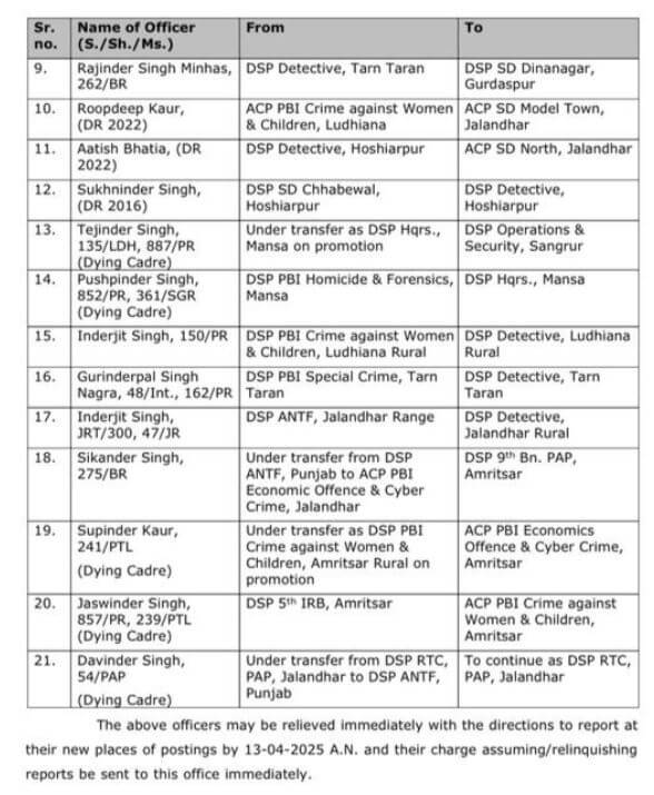 Punjab IPS PPS Transfer : पंजाब में तबादलों का दौर लगातार जारी है। आईएएस के बाद अब पुलिस प्रशासन में बड़ा फेरबदल किया गया है। राज्य सरकार ने एक आईपीएस और 20 पीपीएस अधिकारियों के तबादले किए हैं।