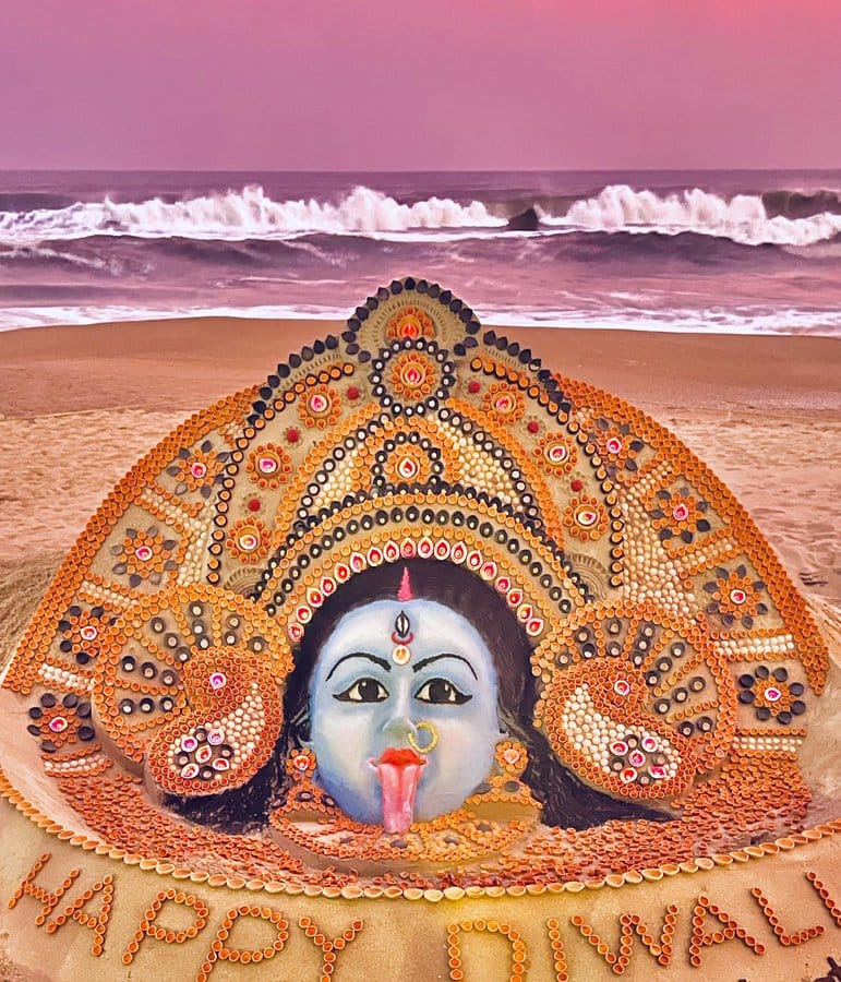 My SandArt of Goddess Maa Kali with installation of 4045 Diyas at Puri beach in Odisha. pic.twitter.com/3GZGe9TANQ— Sudarsan Pattnaik (@sudarsansand) October 24, 2022