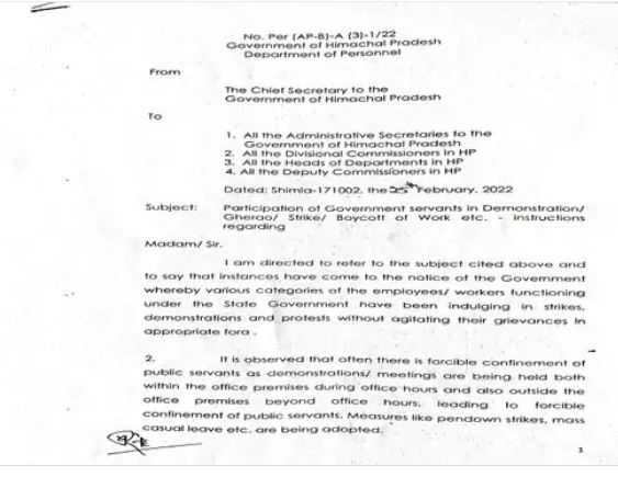 मुख्यमंत्री जयराम ठाकुर के निर्देश के बाद कार्मिक विभाग ने एक चेतावनी आदेश जारी किया है। इसमें सभी प्रशासनिक सचिवों, जिला उपायुक्तों, विभागाध्यक्षों और मंडलायुक्तों को यह पत्र जारी किया गया है। सरकार ने सिविल सर्विस रूल्स 3 और 7 का हवाला देते हुए आदेश जारी किए हैं कि प्रदर्शन, घेराव, हड़ताल, बायकॉट, पेन डाउन स्ट्राइक और सामूहिक अवकाश लेने और इस तरह की अन्य गतिविधियों में शामिल सरकारी कर्मचारियों का वेतन काटा जाएगा।