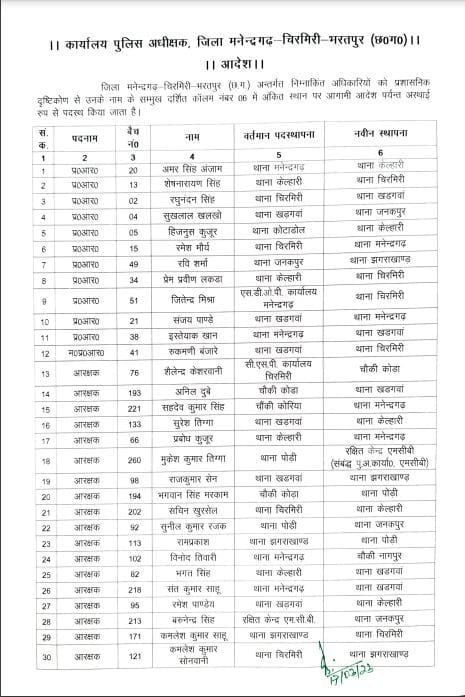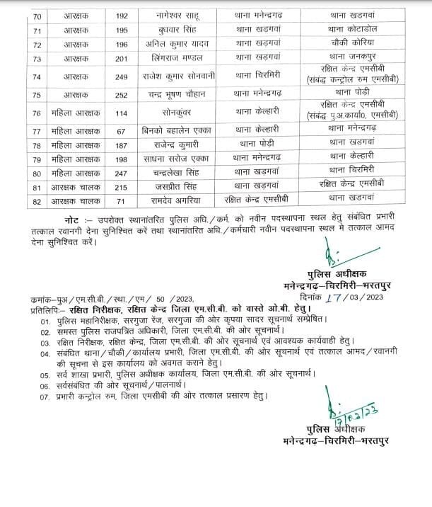 प्रशासनिक दृष्टिकोण से 82 अधिकारियों के तबादले किए गए हैं। छत्तीसगढ़ के भरतपुर के कार्यालय पुलिस अधीक्षक द्वारा जारी आदेश में 82 अधिकारियों को नवीन पदस्थापना सौंपी गई है।