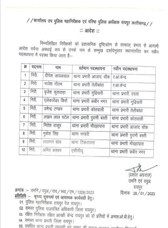 छत्तीसगढ़ शासन द्वारा 10 अधिकारियों को इधर से उधर किया गया है, तत्काल प्रभाव से ने पदभार ग्रहण करने के निर्देश दिए गए हैं।