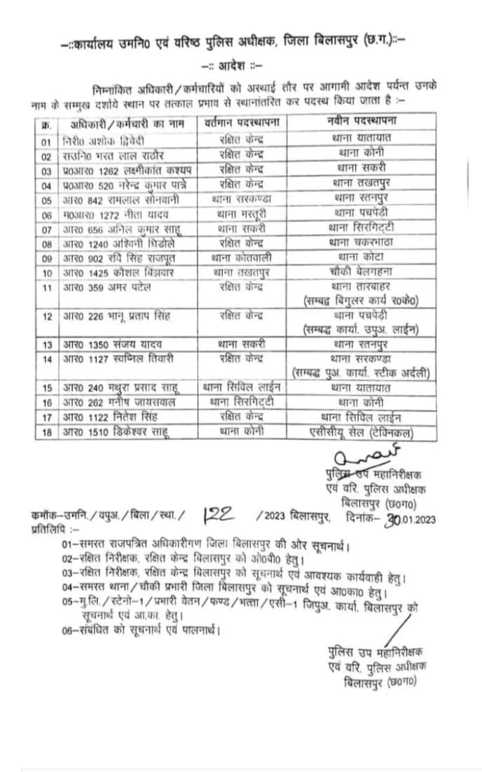 - नरेंद्र कुमार पात्रे को थाना तखतपुर भेजा गया है।