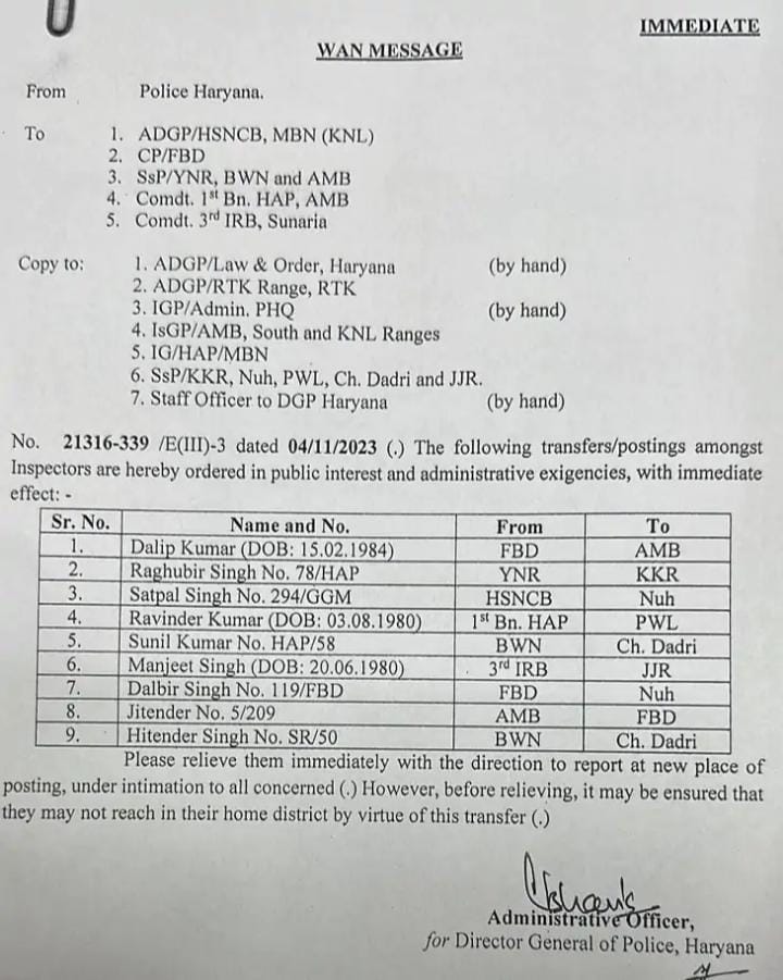 इधर हरियाणा पुलिस द्वारा बड़ी संख्या में अधिकारियों को नवीन प्रतिस्थापन सौंपी गई है। पुलिस महानिदेशक ऑफिस से चार जिले के सीनियर इंस्पेक्टर के ट्रांसफर होने जारी किए गए हैं। तबादला आदेश जारी करते हुए स्पष्ट किया गया है कि पब्लिक इंटरेस्ट को देखते हुए यह सवाल लिखिए जा रहे हैं। तत्काल प्रभाव से अधिकारियों को पद स्थापना ग्रहण करनी होगी।