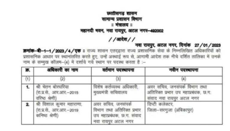 विशाल कुमार महाराणा, अवर सचिव जनसंपर्क विभाग तथा अतिरिक्त प्रभार उप महाप्रबंधक नवा रायपुर अटल नगर डिप्टी कलेक्टर सरगुजा अंबिकापुर नियुक्त किया गया है।