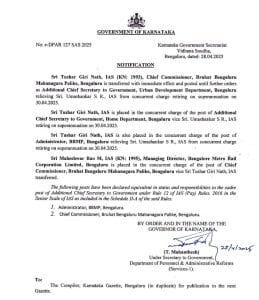 बैच 1993 के आईएएस अफसर तुषार गिरी नाथ, मुख्य आयुक्त, बृहत बेंगलुरू महानगर पालिका, बेंगलुरू को तत्काल प्रभाव से स्थानंतरित करके अतिरिक्त मुख्य सचिव, शहरी विकास विभाग, बेंगलुरू पद पर तैनात किया गया है। आईएएस उमाशंकर एस आर 30 अप्रैल 2025 को समवर्ती प्रभार से रिटायर हो जाएंगे। इसके अलावा उन्हें अतिरिक्त मुख्य सचिव, गृह विभाग, बेंगलुरू और बीबीएमपी, बेंगलुरू के प्रशासक पद का समवर्ती प्रभार भी सौंपा गया है।