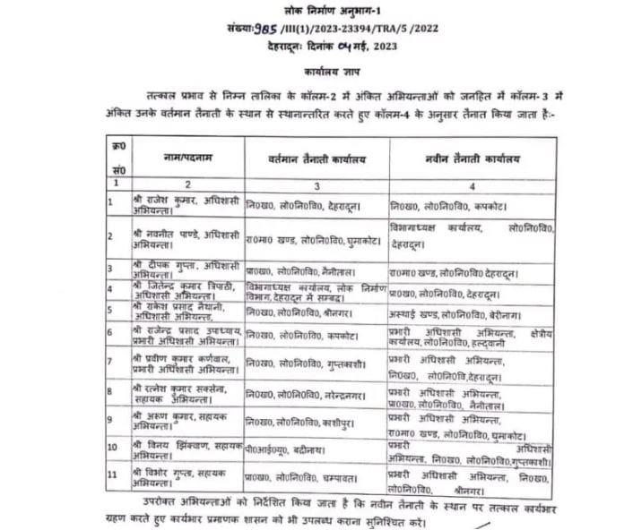 - अधिशासी अभियंता राजेश कुमार निर्माण खंड लोक निर्माण विभाग देहरादून से निर्माण खंड लोक निर्माण विभाग कपकोट तबादला कर दिया गया है।