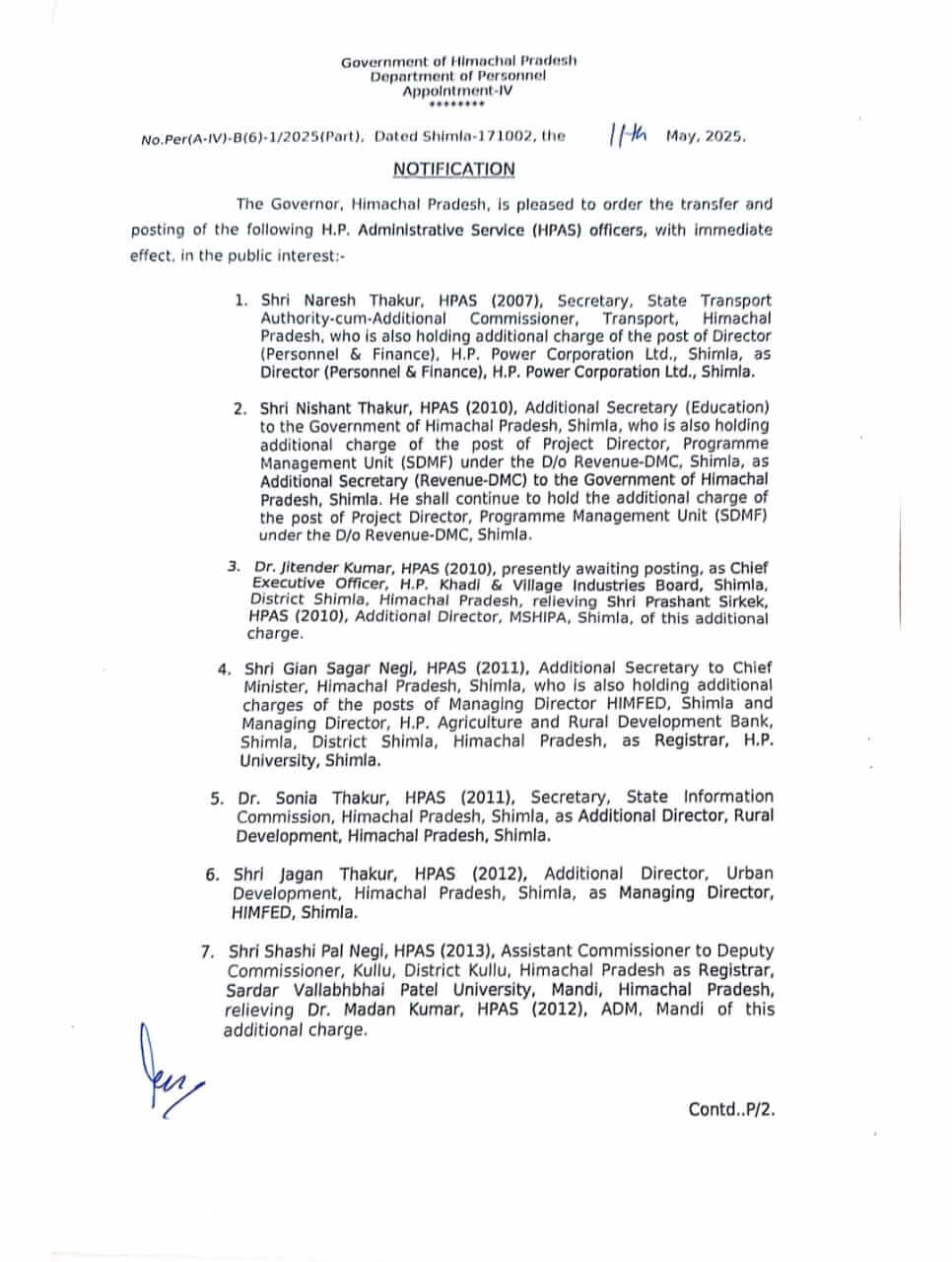 - निशांत ठाकुर अतिरिक्त सचिव (शिक्षा) को परियोजना निदेशक, एसडीएमएफ यूनिट राजस्व-डीएमसी शिमला । परियोजना निदेशक, एसडीएमएफ यूनिट राजस्व-डीएमसी का अतिरिक्त कार्यभार ।