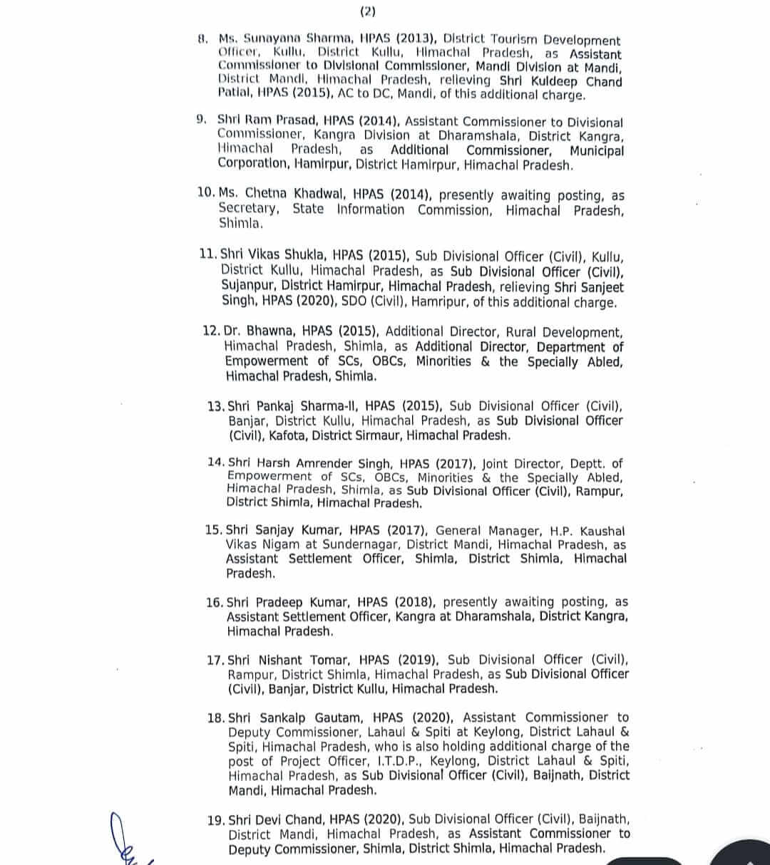- देवी चंद को बैजनाथ के एसडीएम से स्थानांतरित कर शिमला में उपायुक्त कार्यालय में सहायक आयुक्त