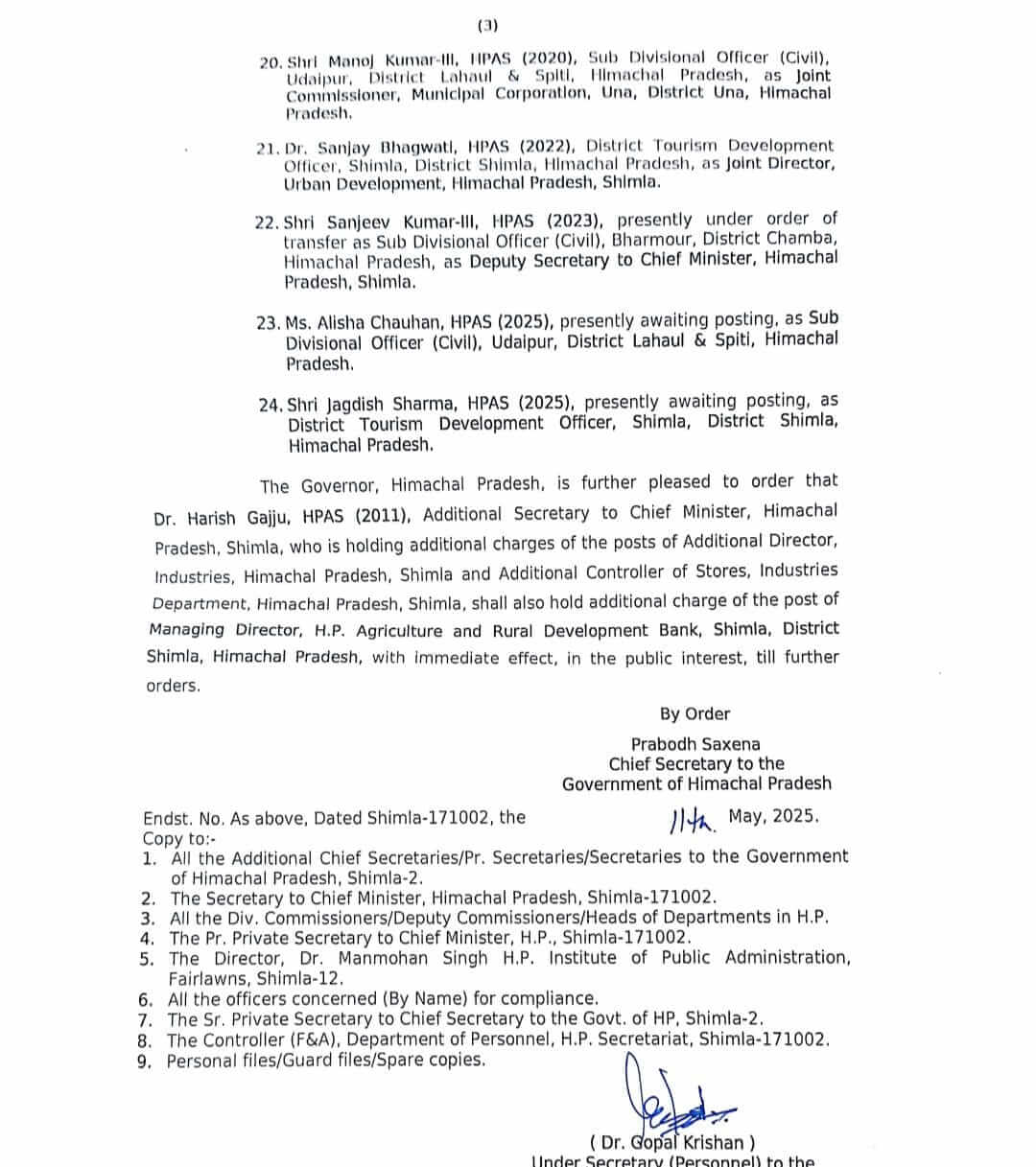 - डॉ. संजय भगवती को शिमला के पर्यटन विकास अधिकारी पद से स्थानांतरित कर शहरी विकास विभाग में संयुक्त निदेशक ।
