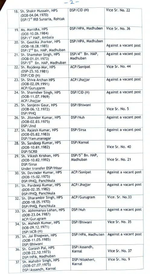 - नरेंद्र सिंह को मधुवन करनाल में डीएसपी-2 लगाया गया है।