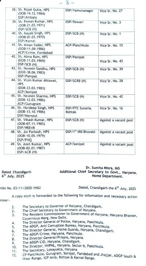 इसके अलावा करनाल, नीलोखेड़ी ,असंध , भिवानी, सिरसा, पलवल, रेवाड़ी, पानीपत में डीएसपी बदले गए है। खुफिया विभाग में भी दो DSP की नई नियुक्ति की गई है, जो राज्य की आंतरिक सुरक्षा से जुड़ी गतिविधियों की निगरानी करेंगे।हरियाणा गृह विभाग की अतिरिक्त मुख्य सचिव ने आदेश जारी कर दिए हैं। ये सभी बदलाव प्रदेश में पुलिस प्रशासन को और अधिक दुरुस्त बनाने के लिए किए गए है।