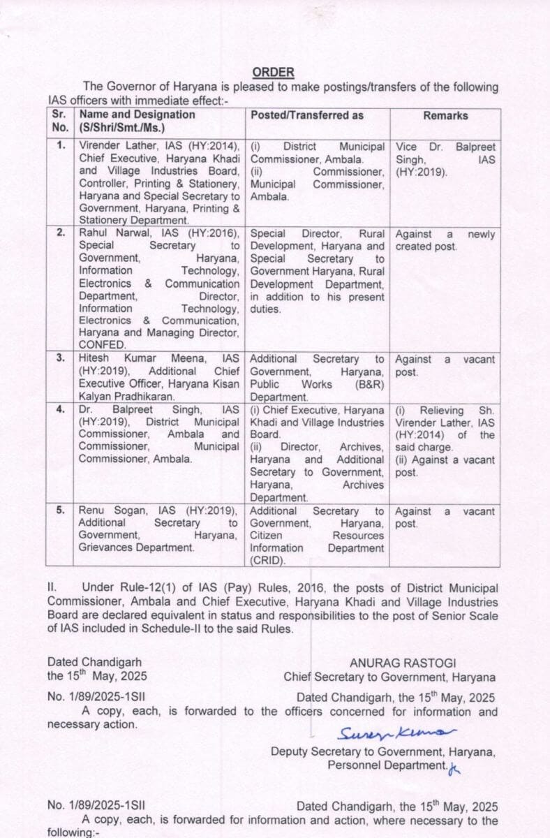 - आईएएस अफसर वीरेंद्र लाठर को अंबाला नगर निगम का कमिश्नर ।