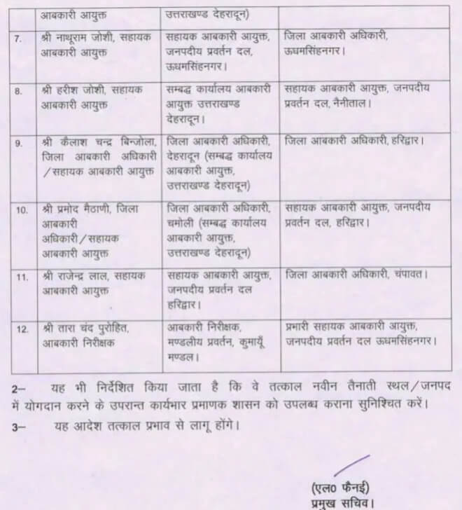 - सहायक आयुक्त हरीश जोशी को आबकारी आयुक्त कार्यालय देहरादून से हटाकर प्रवर्तन दल नैनीताल ।