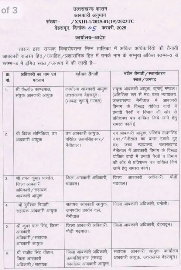 - कुंवर पाल सिंह को जिला आबकारी अधिकारी पौड़ी गढ़वाल से हटाते हुए देहरादून के जिला आबकारी अधिकारी।