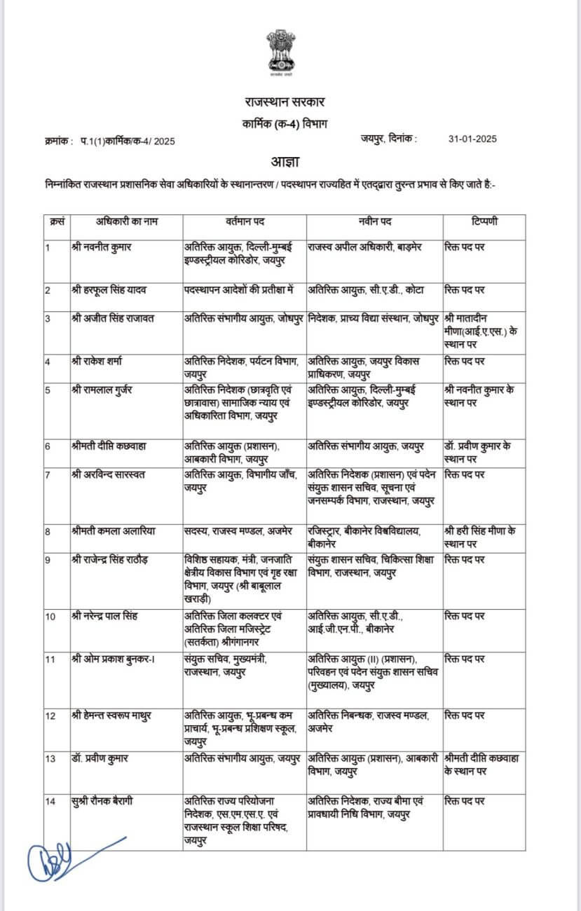 RAS संतोष कुमार मीणा को APO और राजेश सिंह को अतिरिक्त, निदेशक, पर्यटन विभाग, जयपुर के पद का अतिरिक्त चार्ज सौंपा गया है।अजीत सिंह राजावत को निदेशक प्राच्यविद्या संस्थान, जोधपुर और राकेश शर्मा को अतिरिक्त आयुक्त जयपुर विकास प्राधिकरण, जयपुर के रूप में नियुक्त किया गया है।