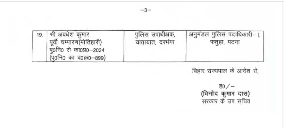 - शुभेंद्र कुमार सुमन को दरभंगा सदर का अनुमंडल पुलिस पदाधिकारी-2।
