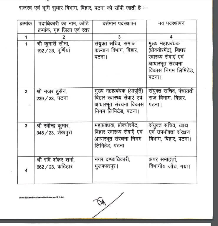 - गया के एडीएम रवींद्र कंमार दिवाकर को एडीएम पटना, तकनीकी सेवा आयोग में ओएसडी मेघावी को एडीएम शिवहर।