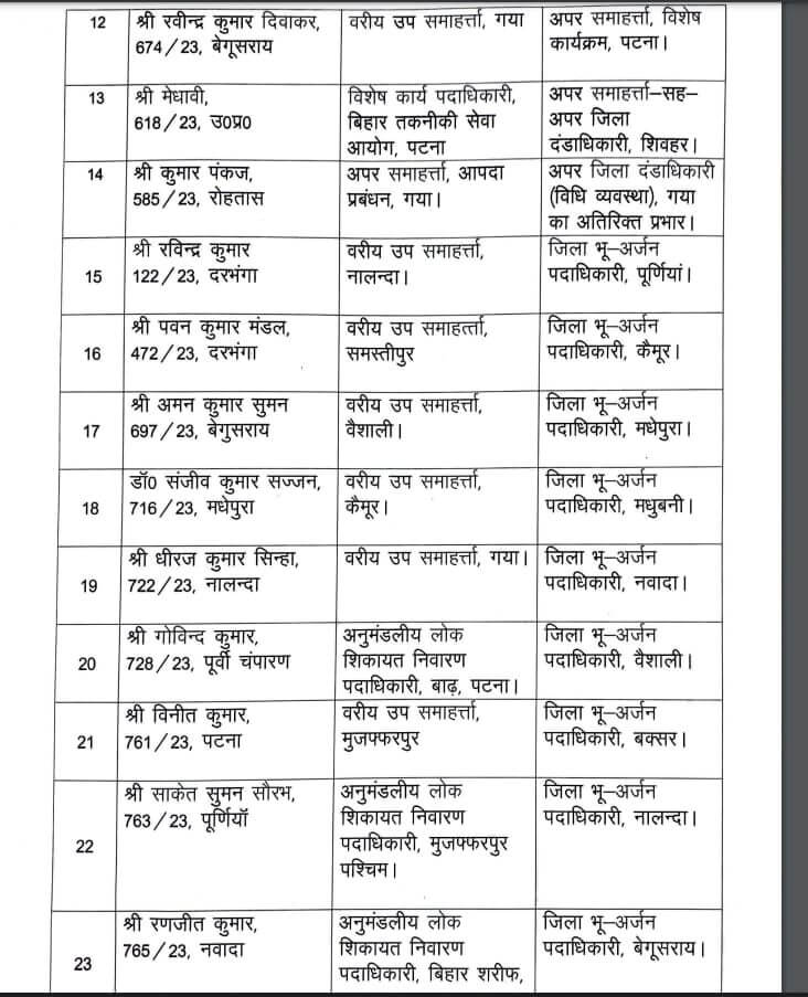 - मुजफ्फरपुर के अनुमंडलीय लोक शिकायत निवारण पदाधिकारी साकेत सुमन सौरभ को नालंदा का जिला भू अर्जन पदाधिकारी।