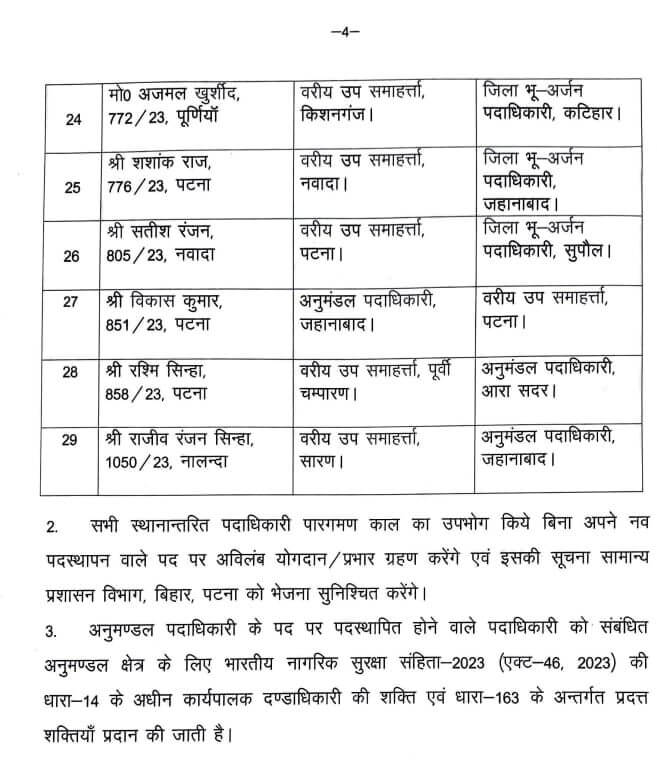 - किशनगंज के एडीएम मो अजमल खुर्शीद को कटिहार का जिला भू अर्जन पदाधिकारी ।
