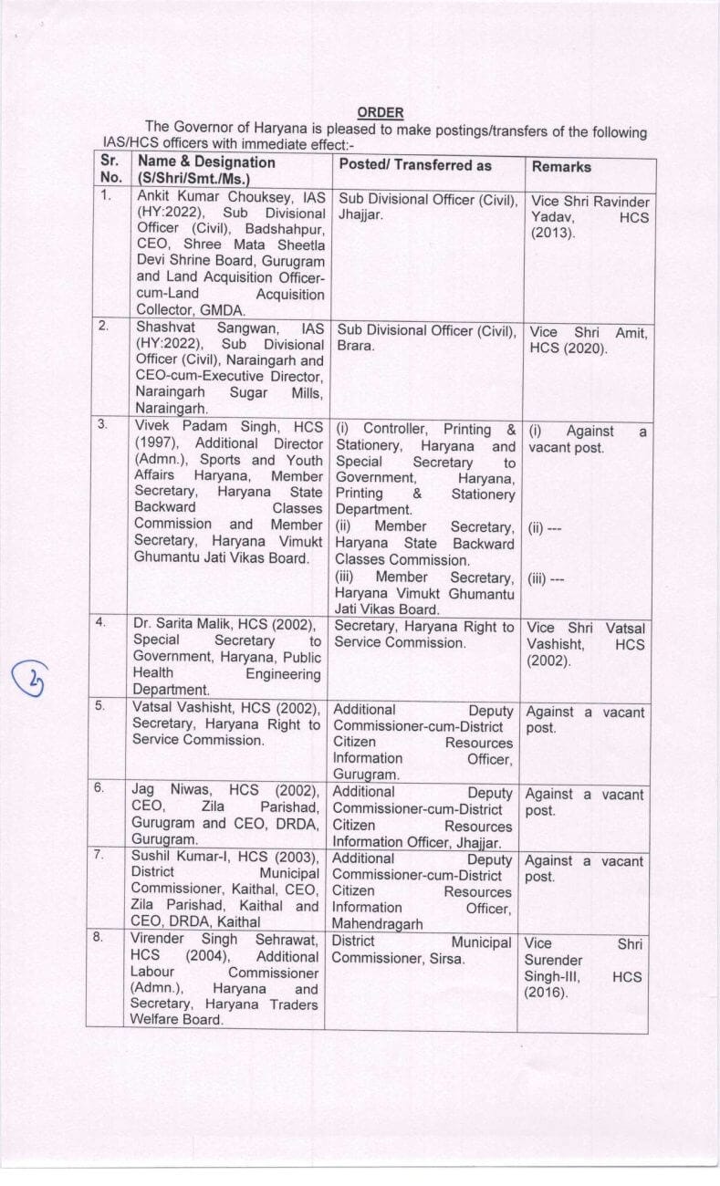 आदेश के मुताबिक, आईएएस अधिकारी अंकित कुमार चौकसे को उपमंडल अधिकारी (नागरिक) झज्जर और आईएएस शास्वत सांगवान को उपमंडल अधिकारी (नागरिक) बराड़ा की जिम्मेदारी सौंपी गई है।
