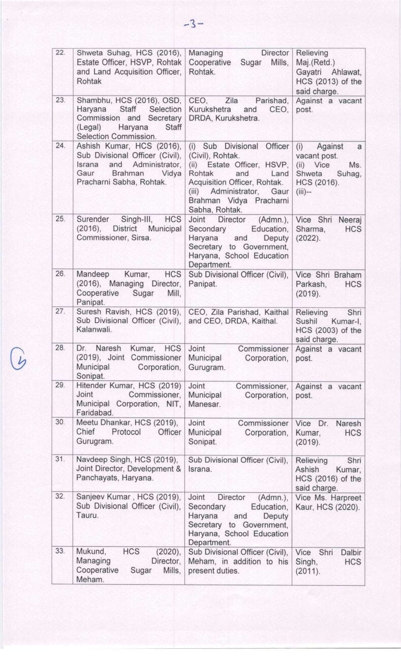 - हरियाणा सफाई कर्मचारी आयोग के सचिव का अतिरिक्त कार्यभार ।