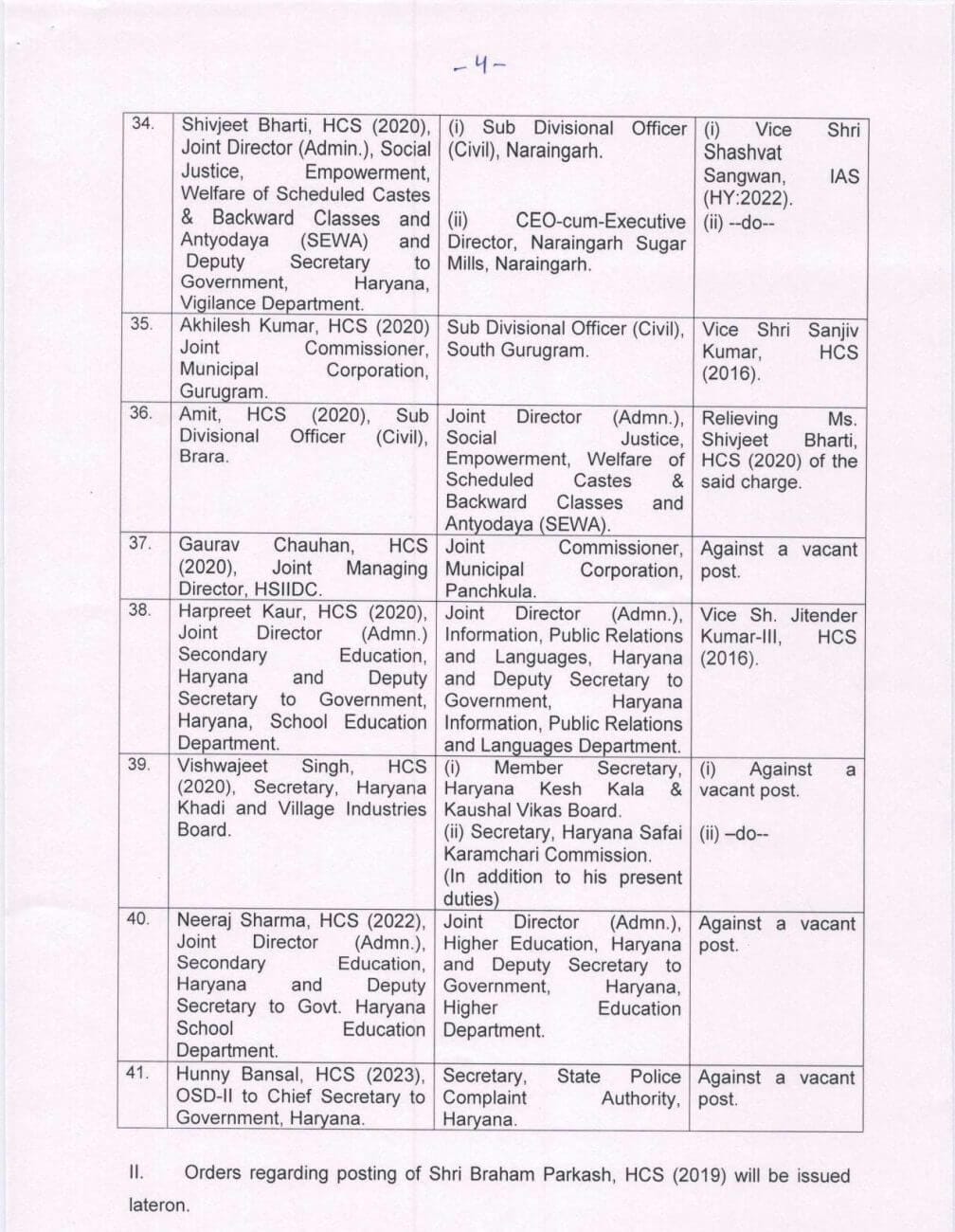 - शिवजीत भारती को उपमंडल अधिकारी (नागरिक), नारायणगढ़ तथा नारायणगढ़ चीनी मिल, नारायणगढ़ का सीईओ एवं कार्यकारी निदेशक ।