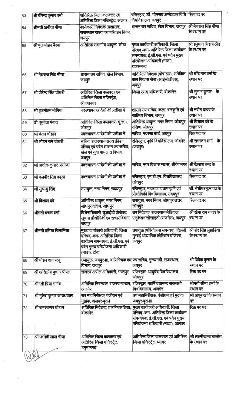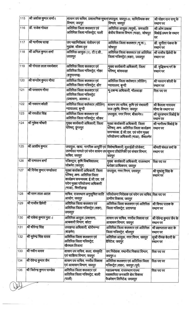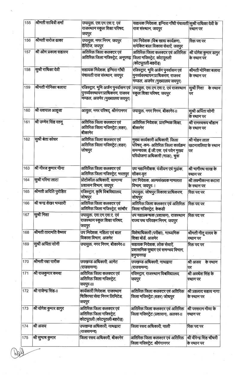 - जगवीर सिंह को मुख्यमंत्री का संयुक्त सचिव, बृजेश चांदोलिया को पंचायतीराज का अतिरिक्त आयुक्त व संयुक्त सचिव , भंवरलाल मेहरड़ा को हरिदेव जोशी पत्रकारिता विवि का रजिस्ट्रार की जिम्मेदारी दी गई है।