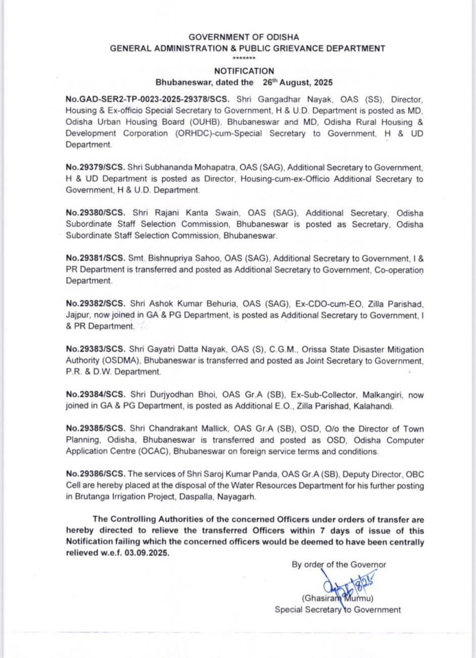 - गंगाधर नायक को ओडिशा शहरी आवास बोर्ड और ओडिशा ग्रामीण आवास एवं विकास निगम का प्रबंध निदेशक। गृह निर्माण एवं नगर विकास विभाग का विशेष सचिव
