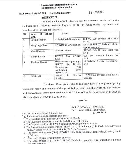 आदेश के तहत,गोविंद ठाकुर को धर्मपुर से लोक निर्माण विभाग के उपमंडल शाट, भाग सिंह राणा को शाट से सलूणी, विनोद शर्मा को ईएनसी कार्यालय शिमला से सैंज, राजेश कुमार को सैंज से ईएनसी कार्यालय शिमला, कुलदीप ठाकुर को रिकांगपिओ से कोटखाई तथा चुनी लाल को कोटखाई से कोटी की जिम्मेदारी सौंपी गई है।