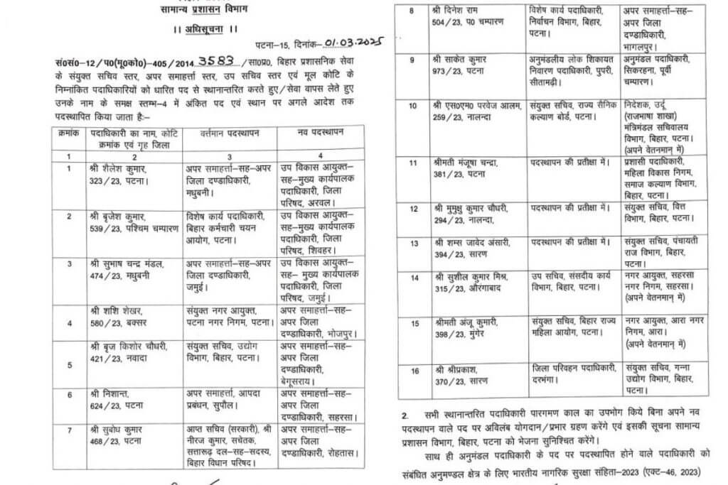 बिहार प्रशासनिक सेवा अधिकारी तबादले