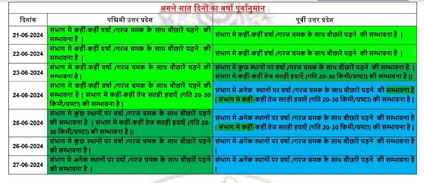 23 से लेकर 26 जून तक सहारनपुर, मेरठ, बुलंदशहर, मुजफ्फरनगर, गाजियाबाद, गौतमबुद्ध नगर, अलीगढ़, कानपुर, खैरी, बहराइच, श्रावस्ती, गोंडा, बलरामपुर, सिद्धार्थनगर, बलरामपुर, महाराजगंज, कुशीनगर, देवरिया, गोरखपुर, अंबेडकनगर, आजमगढ़, जौनपुर, वाराणसी, मिर्जापुर, प्रयागराज, गाजीपुर, मऊ, बलिया, बस्ती, कुशीनगर, महाराजगंज, सोनभद्र, प्रतापगढ़, चंदौली, बांदा, हमीरपुर, फतेहपुर जिलों में बारिश आंधी का अलर्ट जारी किया गया है।24 जून को पूर्वी यूपी गोरखपुर, देवरिया, गाजीपुर, कुशीनगर, वाराणसी, जौनपुर, भदोही, मिर्जापुर, प्रयागराज, आजमगढ़, मऊ, महाराजगंज, बलिया में बारिश।