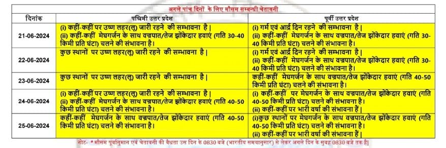 - 23 जून को पश्चिमी यूपी में कहीं कहीं पर गरज चमक के साथ बारिश तो पूर्वी यूपी में कुछ स्थानों पर बारिश के आसार हैं। इस दौरान पश्चिमी यूपी में कहीं कहीं पर ऊष्ण लहर लू और पूर्वी यूपी में कहीं कहीं पर बादल गरजने, बिजली गिरने के साथ ही 30 से 40 किलोमीटर प्रति घंटा की स्पीड से तेज हवा चलने की संभावना है।