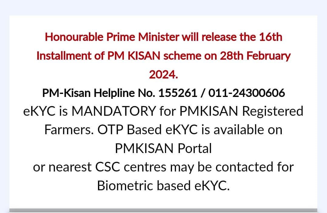 28 फरवरी को पीएम नरेन्द्र मोदी महाराष्ट्र के यवतमाल ज़िले से 8 करोड़ से ज्यादा किसानों के खाते में 16वीं किस्त के 2000-2000 रुपए जारी करेंगे। ध्यान रहे इस किस्त का लाभ केवल उन किसानों को मिलेगा जिन्होंने ईकेवायसी के साथ बैंक खाता आधार से लिंक और भूमि सत्यापन करवा लिया है, जिन किसानों ने ये तीनों काम नहीं किए है, उन्हें राशि का लाभ नहीं मिलेगा।वही अगर आपके फॉर्म में किसी प्रकार की कोई गलती हो गई है या बैंक खाता संख्या गलत है, तो आपकी किस्त अटक सकती है।