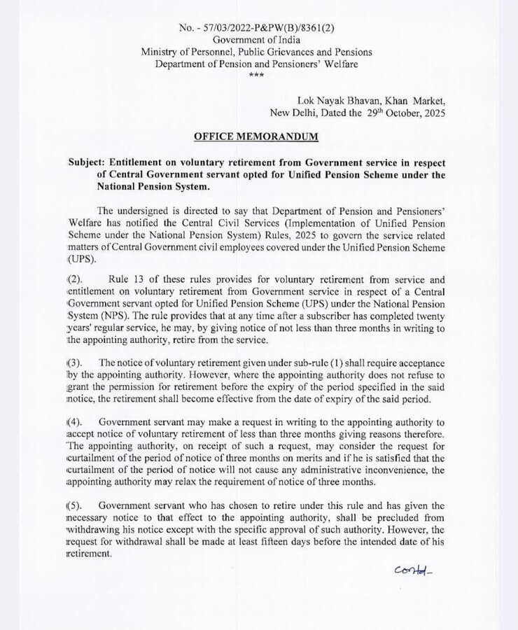 Unified Pension Scheme 2025 : केन्द्रीय कर्मचारियों के लिए काम की खबर है। देश में अप्रैल 2025 से यूपीएस पेंशन लागू है और यूनिफाइड पेंशन स्कीम ऑप्शन चुनने अंतिम तारीख 30 नवंबर 2025 तक है।इससे पहले केंद्र सरकार ने यूनिफाइड पेंशन स्कीम को चुनने वाले कर्मचारियों के लिए वॉलंटरी रिटायरमेंट (VRS) से जुड़े नए नियम जारी किए हैं, जिसमें बताया गया है कि कौन-से कर्मचारी कब और किन शर्तों पर VRS ले सकते हैं और इसके बाद उन्हें क्या क्या लाभ मिलेगा।ध्यान रहे यह नियम उन कर्मचारियों पर लागू होगा जो नेशनल पेंशन सिस्टम (NPS) से UPS में शामिल हुए है।
